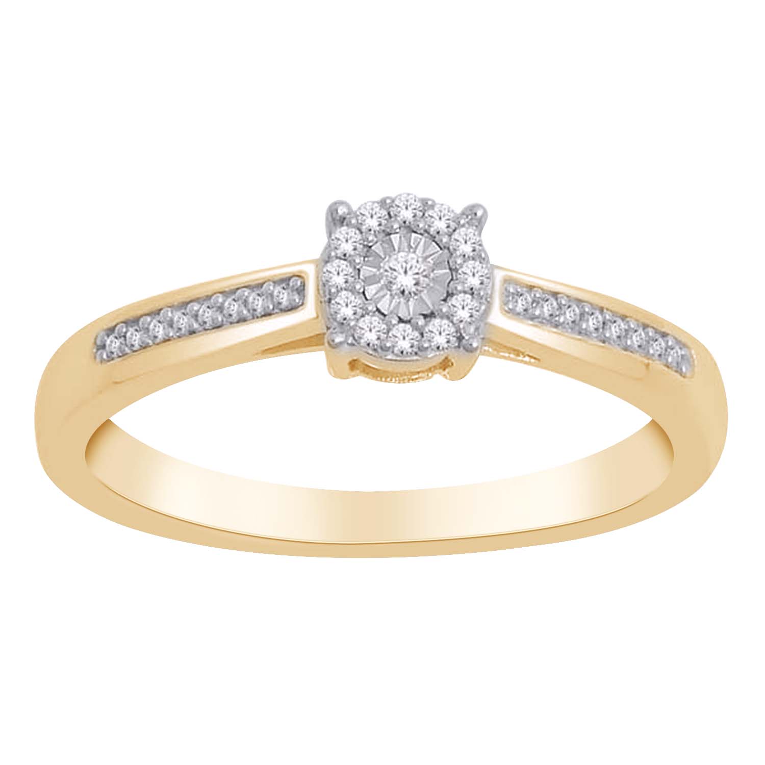 14ct yg illusion set diamond cluster ring with dia set shoulders .10tdw