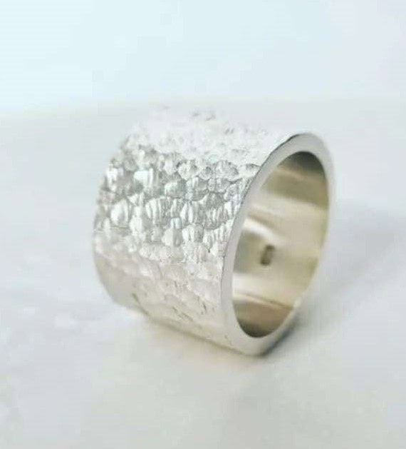 Silver Wide Beaten Ring Hand Made Maree Design